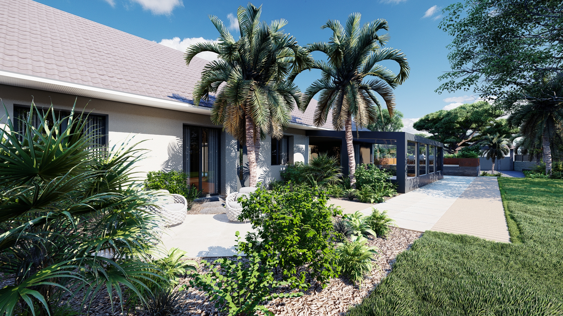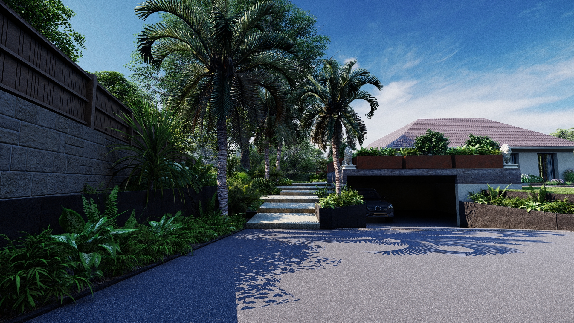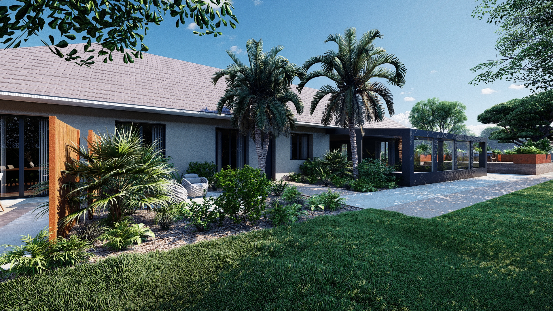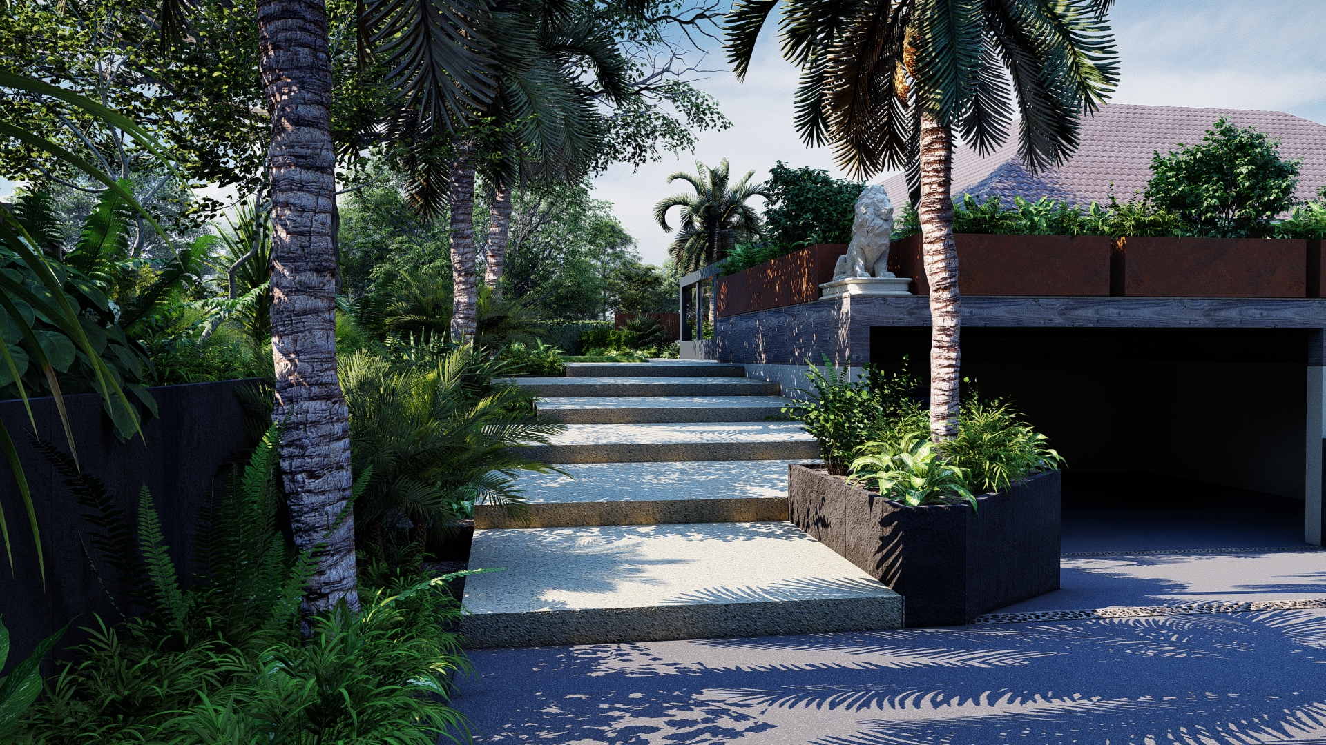 La conception propose une ambiance dépaysante avec un escalier d’inspiration exotique menant à l’entrée de la maison, plusieurs terrasses aux usages variés et des espaces dédiés au bien-être.