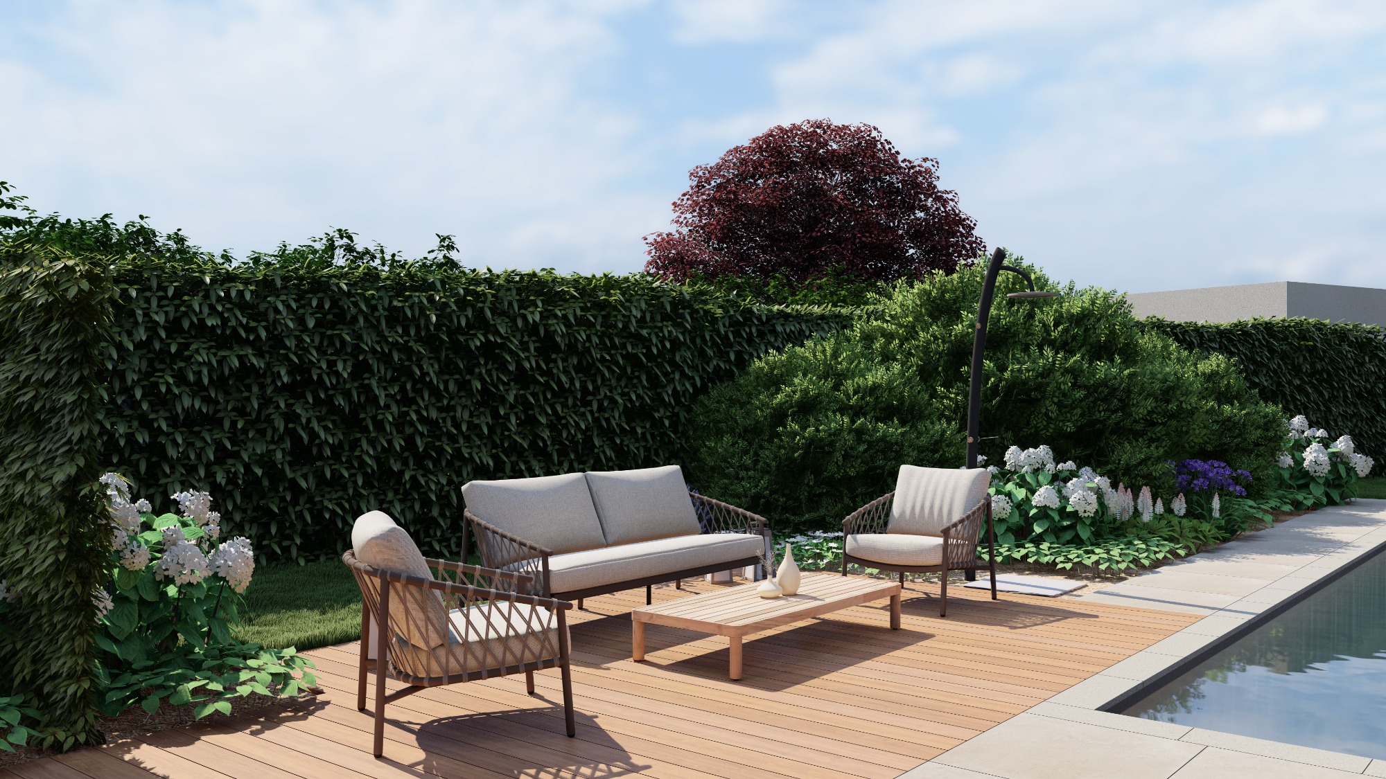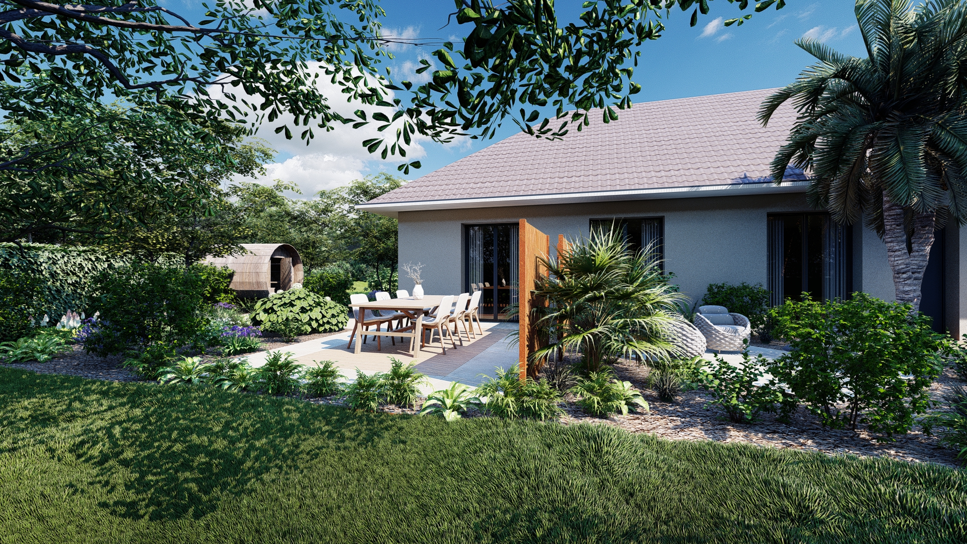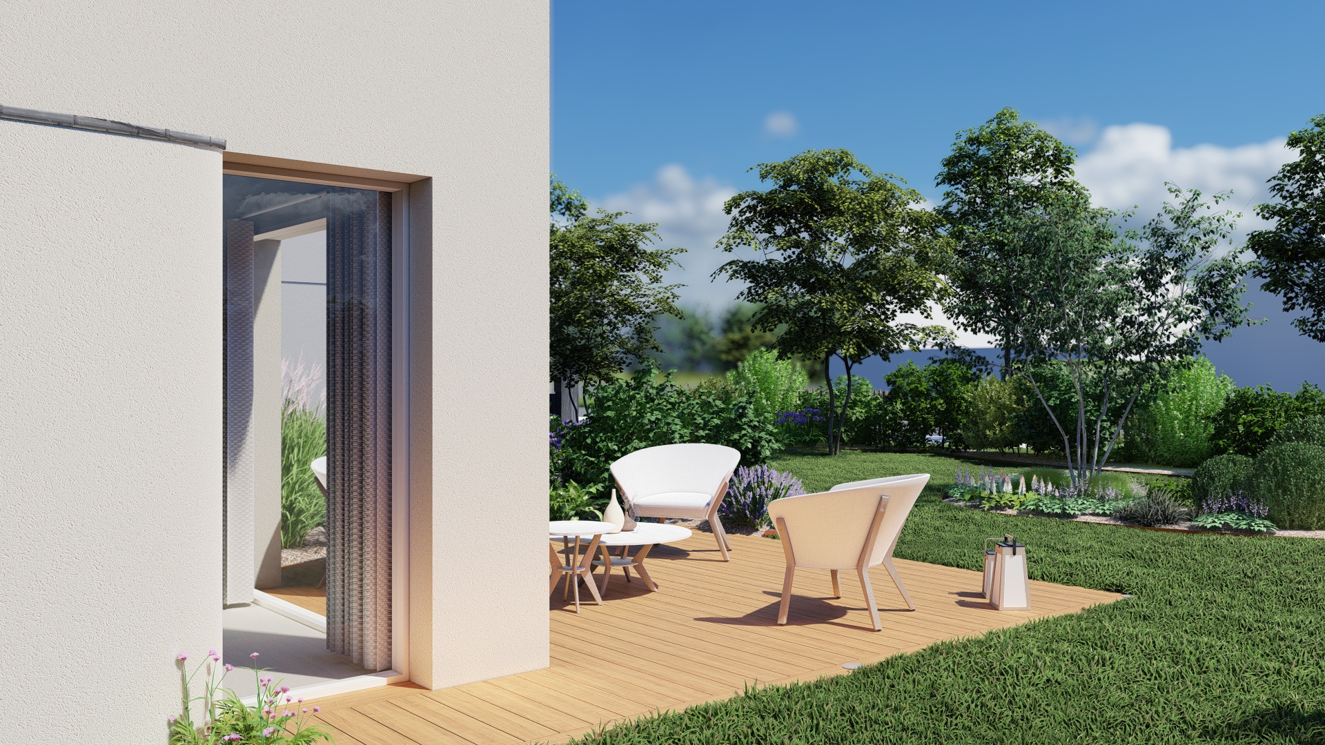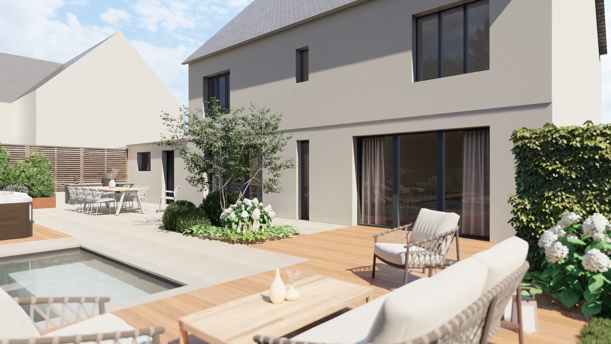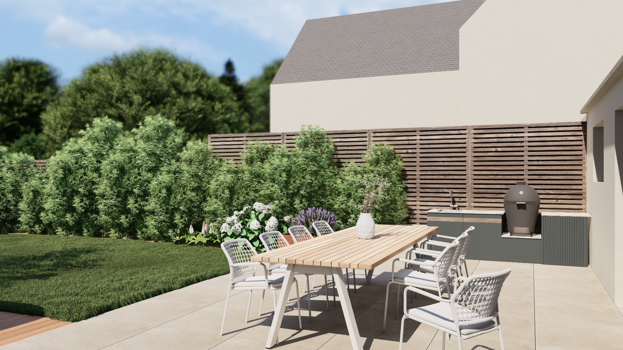 Projet d’aménagement de jardin à Cesson-Sévigné (35) intégrant une terrasse en bois et grès cérame avec massif paysager intégré.