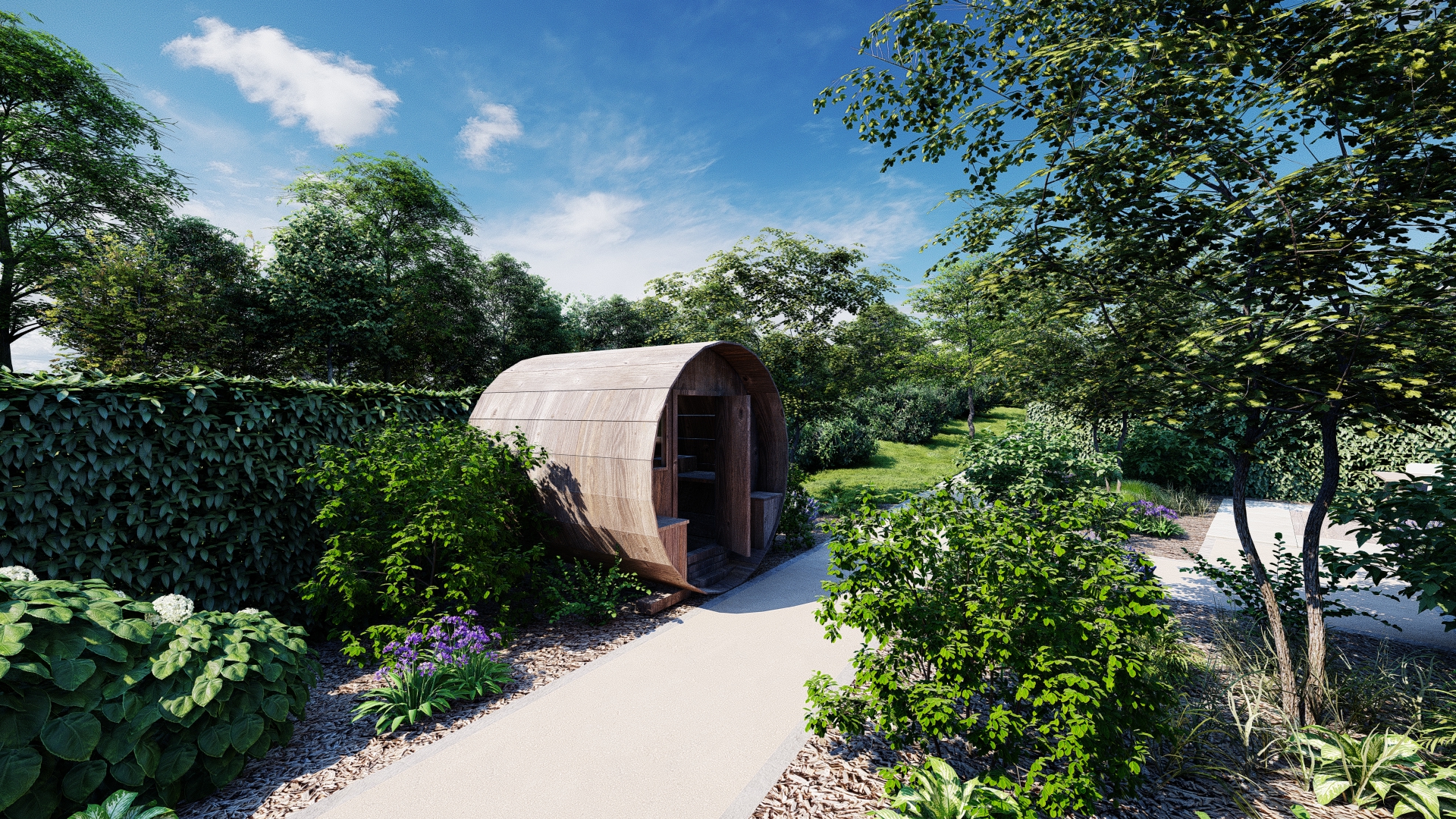 Le jardin intègre notamment un sauna norvégien, un terrain de pétanque, de grands massifs minéraux, une piscine sous véranda, un îlot en bois avec salon de jardin, un coin brasero ainsi qu’un bassin naturel accompagné d’une rivière sèche, créant une atmosphère à la fois chaleureuse et immersive.