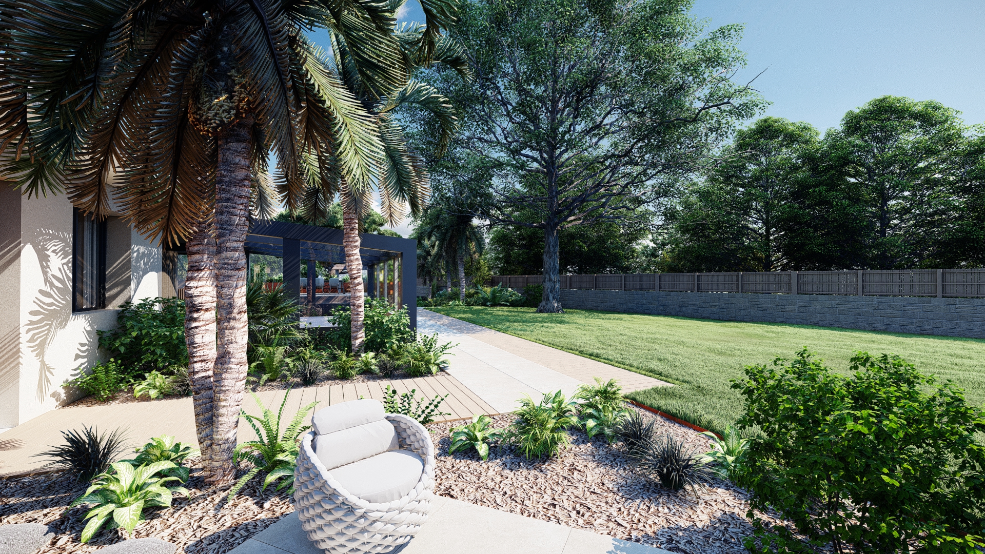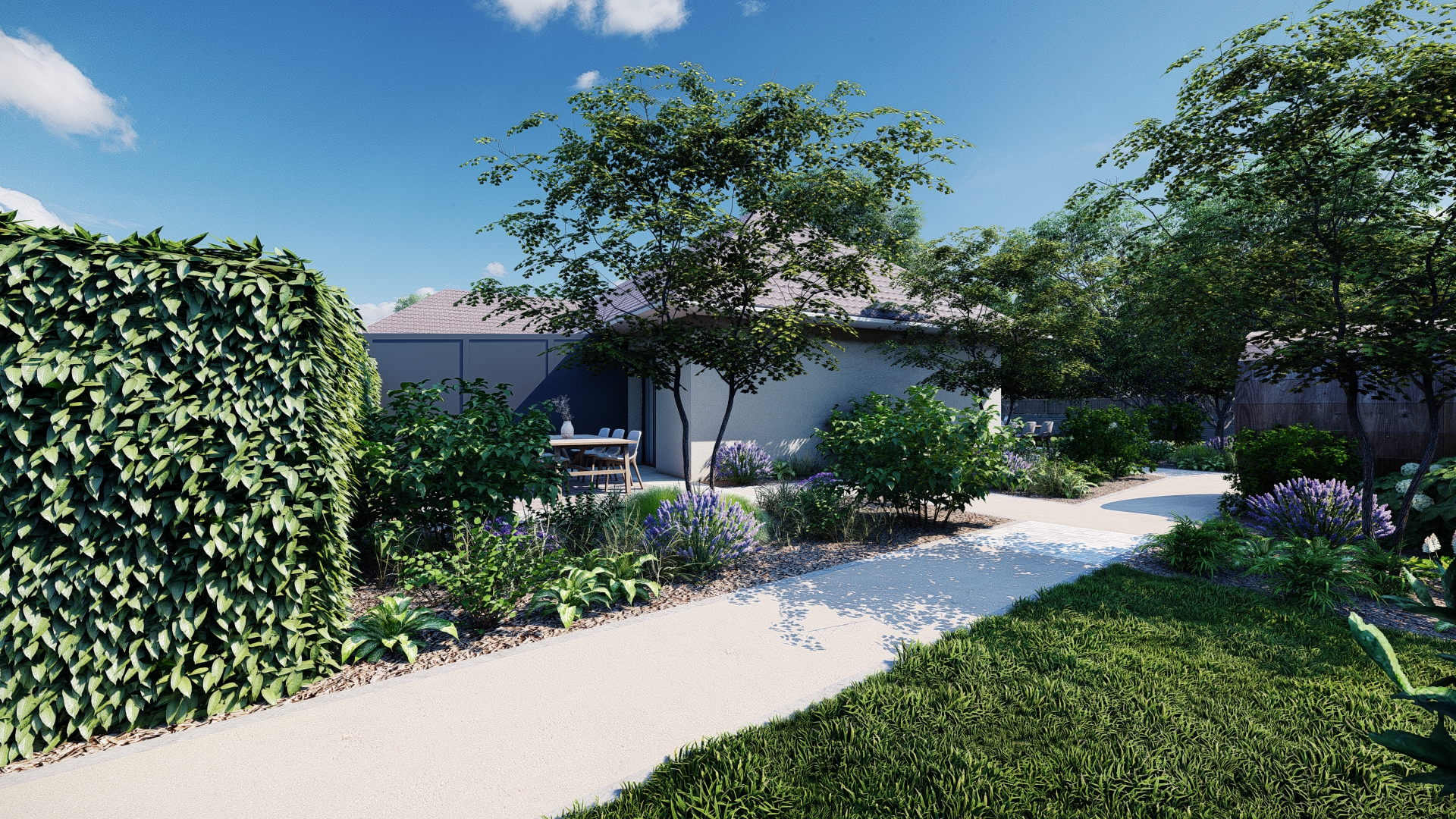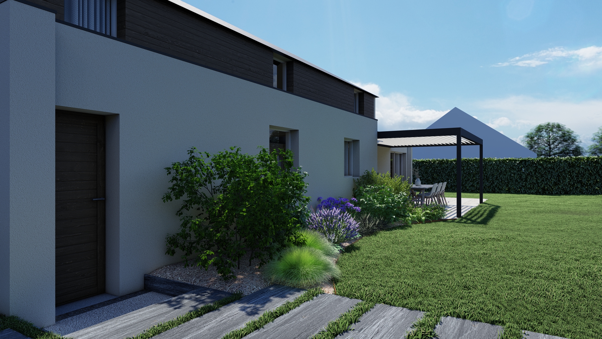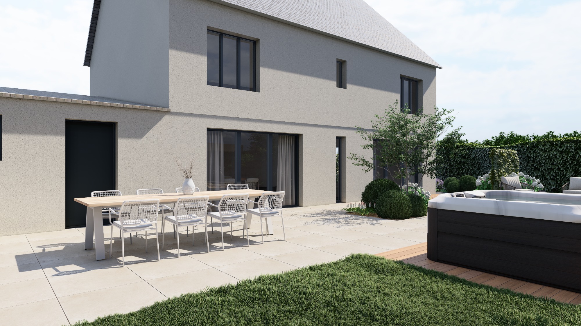 Projet d’aménagement paysager situé près de Rennes (35), pensé pour structurer les circulations et créer des espaces de vie agréables autour de la maison.