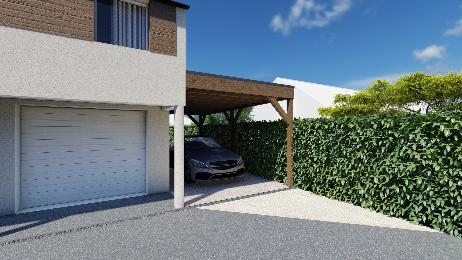 À l’entrée, une cour en enrobé est associée à une allée pavée guidant naturellement vers la porte d’entrée. Des massifs paysagers viennent structurer l’espace tout en préservant l’intimité d’une première terrasse en bois située à l’avant de la maison.