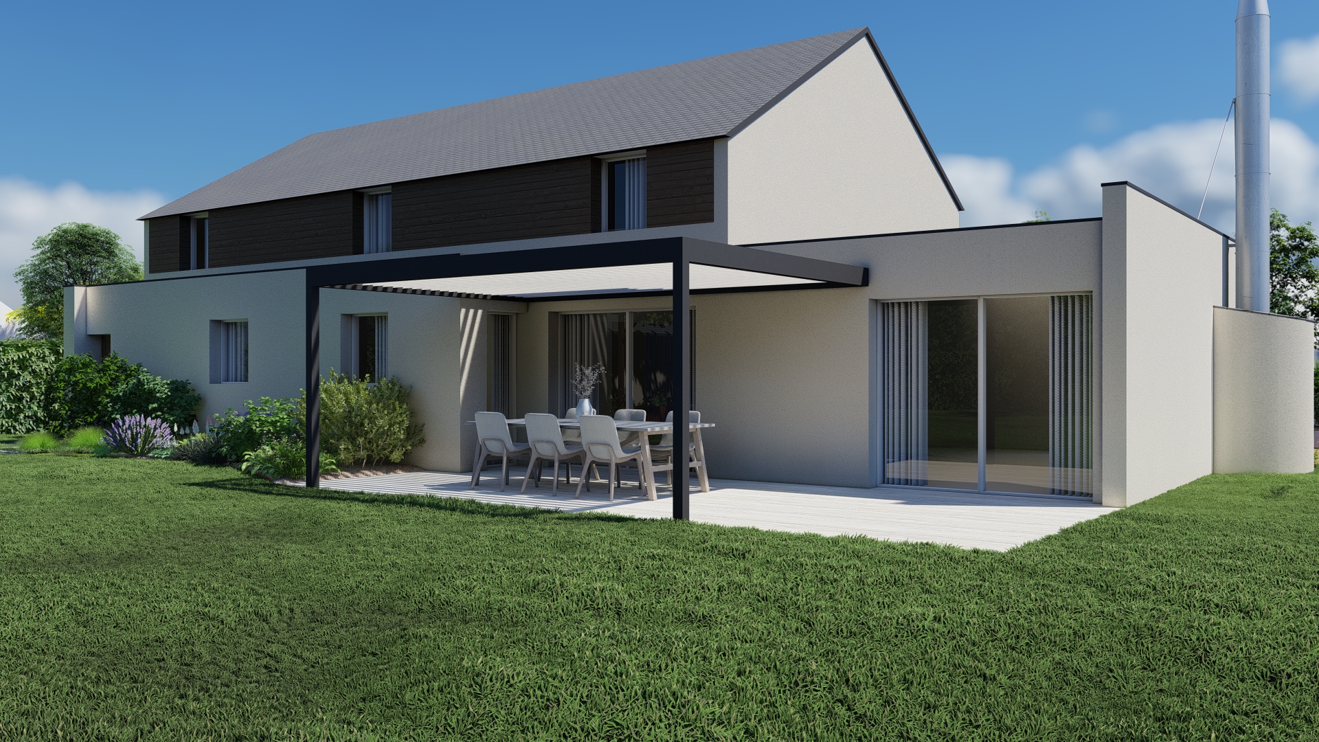 À l’arrière, une terrasse en grès cérame équipée d’une pergola bioclimatique permet de profiter des repas extérieurs tout en maîtrisant l’ensoleillement.