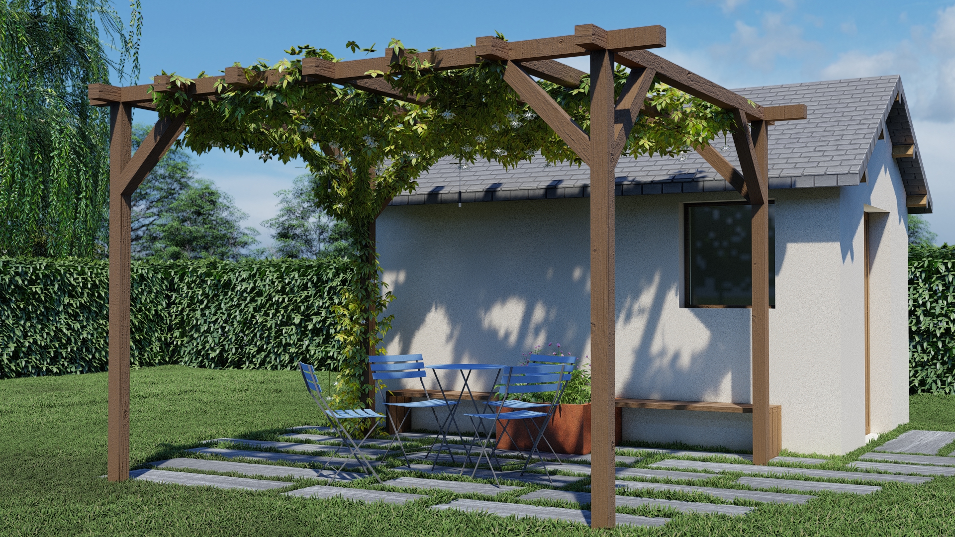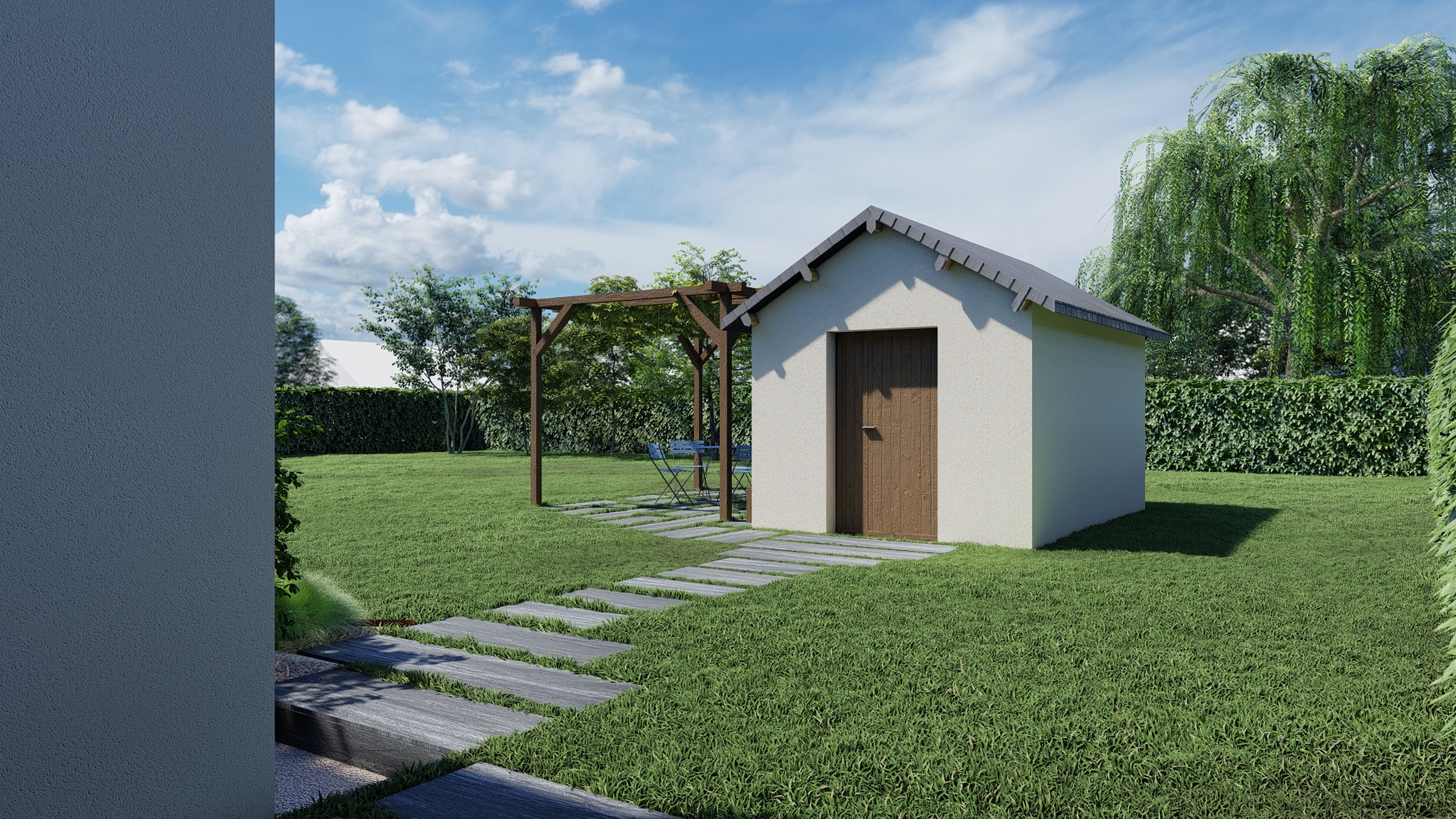 Une allée en palis de schiste assure un accès esthétique à l’abri de jardin, prolongée par une petite terrasse réalisée dans les mêmes matériaux. L’ensemble est agrémenté d’une pergola en bois accueillant un jasmin parfumé, apportant ombre et ambiance végétale.